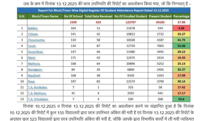 मथुरा/देवेन्द्र शर्मा। जिला बेसिक शिक्षा अधिकारी श्रीमती रतन कीर्ति ने 11 दिसंबर को पत्र जारी करते हुए जनपद के 1384 प्रधानाध्यापकों का अग्रिम आदेशों तक वेतन अवरुद्ध करने का आदेश जारी किया था। क्योंकि इन प्रधानाध्यापकों द्वारा छात्र-छात्राओं की डिजिटल उपस्थित नहीं की जा रही थी। विभागीय कार्यों की अवहेलना मानते हुए जिला बेसिक शिक्षा अधिकारी श्रीमती रतन कीर्ति ने इन प्रधानाध्यापकों का वेतन अवरुद्ध कर दिया था। बेसिक शिक्षा अधिकारी के कड़े रुख के बाद 13 दिसंबर को 523 प्रधानाध्यापकों ने डिजिटल उपस्थित प्रारंभ कर दी है। अब प्रधानाध्यापकों के द्वारा विभागीय कार्य में रुचि लिए जाने के कारण वेतन बहाल का आदेश इस शर्त के साथ किया गया है कि भविष्य में प्राथमिकता के आधार पर डिजिटल रजिस्टर के अंतर्गत उपलब्ध पंजीकाओं के डिजिटाइजेशन के साथ-साथ छात्र उपस्थिति पंजिका के माध्यम से प्रतिदिन छात्रों की उपस्थिति अंकित करना सुनिश्चित करेंगे।